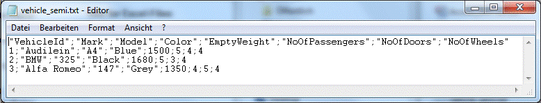<table data-full-width="true"><thead><tr><th>Keyword</th><th>Remark</th></tr></thead><tbody><tr><td>HDR=No</td><td>First row does not contain field description.</td></tr><tr><td>HDR=Yes</td><td>First row contains field description.</td></tr><tr><td>FMT=Delimited</td><td><p>Delimited fields with default delimiter.<br>See Windows start button → settings → control panel → regional settings, Number tab → list separator</p><p>You can access files that use nonstandard text delimiters and fixed-width text files by creating a schema.ini file in the same directory as the text file. A text file, vehicle_semi.txt.</p><p><img src="https://2873353689-files.gitbook.io/~/files/v0/b/gitbook-x-prod.appspot.com/o/spaces%2FfK1YJaTCqOiS0L22wVKG%2Fuploads%2Fgit-blob-dd46c024138ada8e8a4af2c89ffd55760645a088%2FOMrunHelp_OwnDataAdapter4.gif?alt=media" alt="" data-size="original"></p><p>A possible schema.ini file for the vehicle_semi.txt file is:</p><p>[vehicle_semi.txt]<br>Format=Delimited(;)<br>ColNameHeader=True<br>MaxScanRows=0<br>Character=OEM<br>Col1=VehicleId Long Width 4<br>Col2=Mark Text Width 255<br>Col3=Model Text Width 255<br>Col4=Color Text Width 255<br>Col5=EmptyWeight Long Width 255</p></td></tr><tr><td></td><td><p>The connect string contains the information that the provider need to know to establish a connection to the database or the data file.</p><p>Assembly:<br>A connect string consists of a series of keywords - value pairs separated by semicolons (;)</p><ul><li>The equal sign (=) connects each keyword and its value<br>Example: Key1=Value1;Key2=Value2;Key3=Value3;</li><li>The information in the connection string is passed on to the provider</li></ul><p>The connect string may contains placeholders like myServer, myDataBase and myUserName, myPassword and myPort. These placeholders will be resolved in Environment.</p><p>Click <a href="https://www.connectionstrings.com/">https://www.connectionstrings.com/</a> for more information about connect strings (external link).</p></td></tr><tr><td></td><td><p>Enter your comments or parameter description here.</p><p>You can specify the fields in the text file in two ways:</p><ul><li>Include the field names in the first row of the text file and set the <strong>ColNameHeader</strong> option to True.</li><li>Identify each column using the format ColN (where N is the one-based column number) and specify the name, width, and data type for each column.</li></ul><p>The <strong>MaxScanRows</strong> option indicates how many rows should be scanned to automatically determine column type. A value of 0 indicates that all rows should be scanned.</p><p>The <strong>ColN</strong> entries specify the name, width, and data type for each column. This entry is required for fixed-length formats and optional for character-delimited formats. The syntax of the ColN entry is:</p><p><strong>ColN</strong>=columnName dataType [Width n]</p><p>The parameters in the entry are:</p><p>columnName</p><ul><li>The name of the column. If the column name contains spaces, it must be enclosed in double quotation marks.</li></ul><p>dataType</p><ul><li>The data type of the column. This value can be Bit, Byte, Currency, DateTime, Double, Long, Memo, Short, Single, or Text.</li><li>DateTime values must be in one of the following formats: dd-mmm-yy, mm-dd-yy, mmm-dd-yy, yyyy-mm-dd, or yyyy-mmm-dd, where mm is the month number and mmm are the characters specifying the month.</li></ul><p>Width n</p><ul><li>The literal value Width followed by the integer value specifying the column width.</li></ul><p>The <strong>Character</strong> option specifies the character set; you can set it to either ANSI or OEM.</p></td></tr><tr><td></td><td></td></tr><tr><td>Format=CSVDelimited</td><td>Fields are delimited with commas. This is the default value.</td></tr><tr><td>Format=Delimited(customCharacter)</td><td>Fields are delimited with a custom character. You can use any single character except the double quotation mark (") as a delimiter.</td></tr><tr><td>Format=FixedLength</td><td>Fields are fixed length. If the ColumnNameHeader option is True, the first line containing the column names must be comma-delimited.</td></tr><tr><td>Format=TabDelimited</td><td>Fields are delimited with tabs.</td></tr><tr><td></td><td></td></tr><tr><td>Format=CSVDelimited</td><td>Fields are delimited with commas. This is the default value.</td></tr><tr><td>Format=Delimited(customCharacter)</td><td>Fields are delimited with a custom character. You can use any single character except the double quotation mark (") as a delimiter.</td></tr><tr><td>Format=FixedLength</td><td>Fields are fixed length. If the ColumnNameHeader option is True, the first line containing the column names must be comma-delimited.</td></tr><tr><td>Format=TabDelimited</td><td>Fields are delimited with tabs.</td></tr><tr><td></td><td></td></tr><tr><td>Format=CSVDelimited</td><td>Fields are delimited with commas. This is the default value.</td></tr><tr><td>Format=Delimited(customCharacter)</td><td>Fields are delimited with a custom character. You can use any single character except the double quotation mark (") as a delimiter.</td></tr><tr><td>Format=FixedLength</td><td>Fields are fixed length. If the ColumnNameHeader option is True, the first line containing the column names must be comma-delimited.</td></tr><tr><td>Format=TabDelimited</td><td>Fields are delimited with tabs.</td></tr></tbody></table>